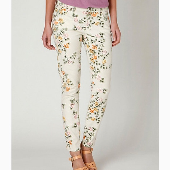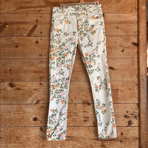 Lightweight stretch denim Allover floral print High waist slim fit 9 rise 31 inseam Great condition no damage or stains. 98 cotton 2 polyurethane. Waist 145 inches Rise 95 inches Inseam 30 inches.